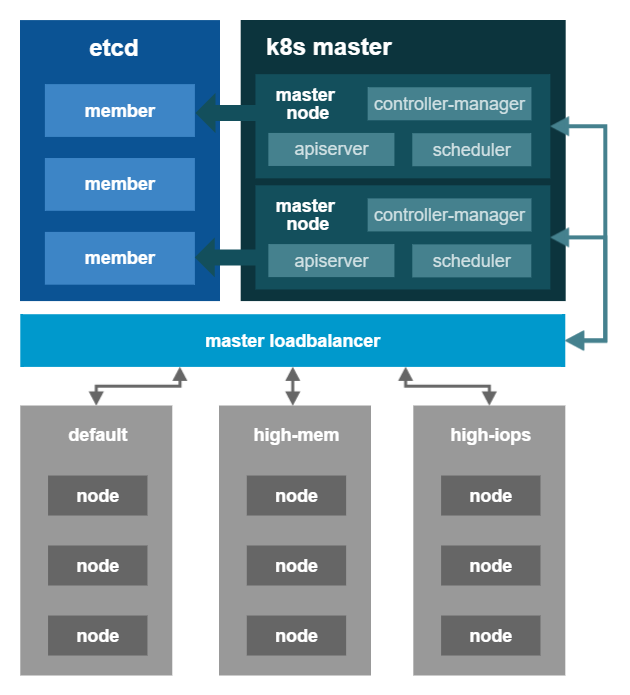 kube-apiserver,kube-controller-manager,kube-scheduler的服务器,为整个集群的控制平面提供了高可用性。 - 多个运行节点服务器组,有着不同的CPU,内存,磁盘配置。让我们可以灵活的根据业务对运行环境的要求来选择不同的服务器组。