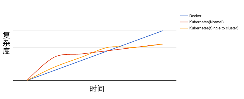 下图是一张学习曲线的示意图,可以看到当引入单节点Kubernetes作为过渡之后, 整个学习曲线更加平滑,在早期简单环境时更接近Docker, 在后期环境完整时又能够充分利用Kubernetes的优势。